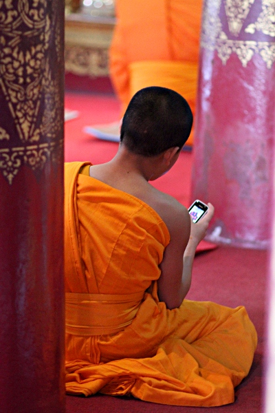 Nicht alle Mönche in Laos sind mit vollem Herzen bei der Sache, wenn es um die Rezitationen am Abend geht. Einige kümmern sich offenbar lieber um die neuesten Nachrichten auf ihrem Mobiltelefon.