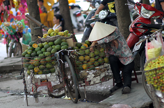 Wie man seinen Verkaufswagen… äh, das Verkaufsfahrrad gleich auf mehrere Weise praktisch nutzen kann, zeigt diese Händlerin hier. Man beachte übrigens auch den Ständer auf der linken Seite, der dafür sorgt, dass das Fahrrad nicht umkippt. Normalerweise wird das Fahrrad an der Stange, die hinten lang herausragt, geschoben. Es ist also kein echte Fahrrad, sondern ein Schiebrad.