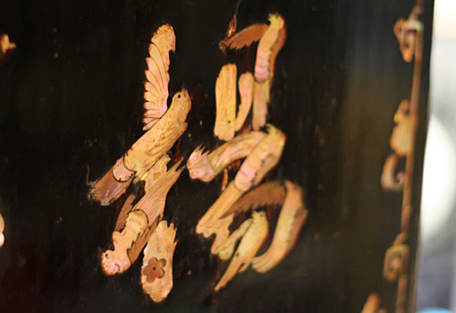Buchstaben, in Holz eingearbeitet. In Vogelform.