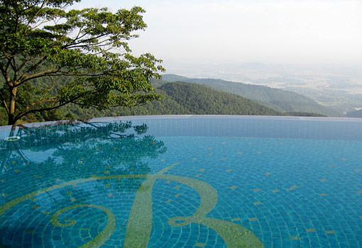 Dieses Schwimmbecken befindet sich in Tam Dao, einer Bergregion ganz in der Nähe von Hanoi. Viele Hanoier flüchten in den heißen Sommerwochen gerne für ein Wochenende hierher, das benötigt gerade mal etwa eine Stunde Busfahrt. Die meisten Hotels und Pensionen sind eher einfach. Ein Hotel ist jedoch deutlich luxuriöser und aufwändiger. Unter anderem mit Pool. Das Schwimmbecken reicht bis an den Rand des Bergs. Man muss beim Schwimmen immer aufpassen, dass man keine Höhenangst bekommt.