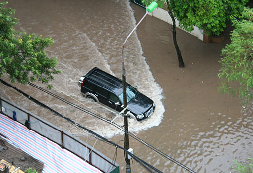 Als Autofahrer hat man es nicht ganz leicht in Hanoi. Man weiß nie so genau, wann das Auto anfängt zu schwimmen, oder ob es noch reicht. Eine Bekannte erzählte einmal von einer Taxifahrt, bei der sie die Füße auf die Rücksitzbank stellen musste, weil der gesamte Fußraum unter Wasser stand. Glücklicherweise muss der Motor immer noch oberhalb des Wasserspiegels gelegen haben. Foto stammt aus dem August 2009.